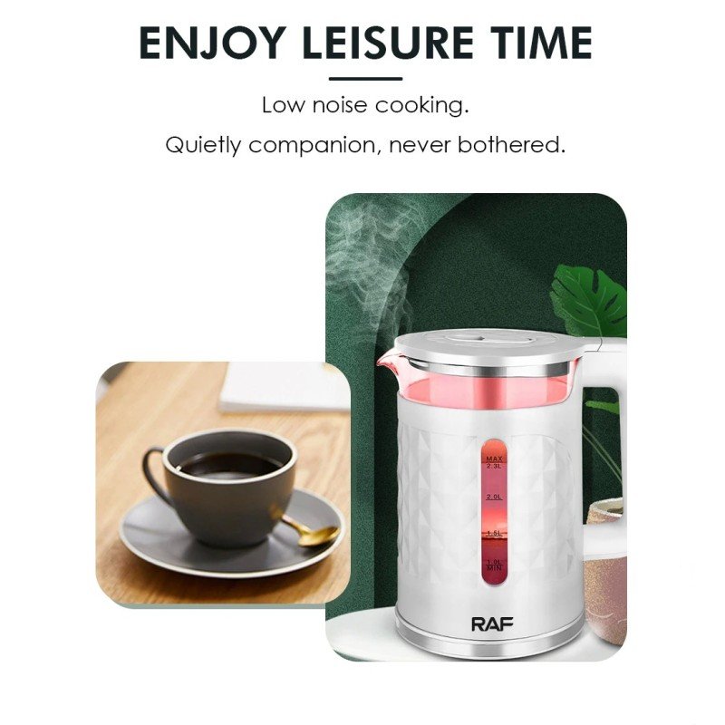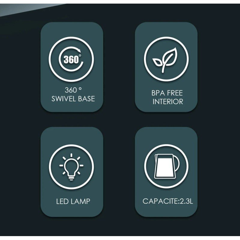 | Funciones | (1) Hierve agua en un instante: ¡Este hervidor eléctrico funciona con 1500 W (220 V) y hierve una olla llena de agua de 2,3 l en menos de 6 minutos!