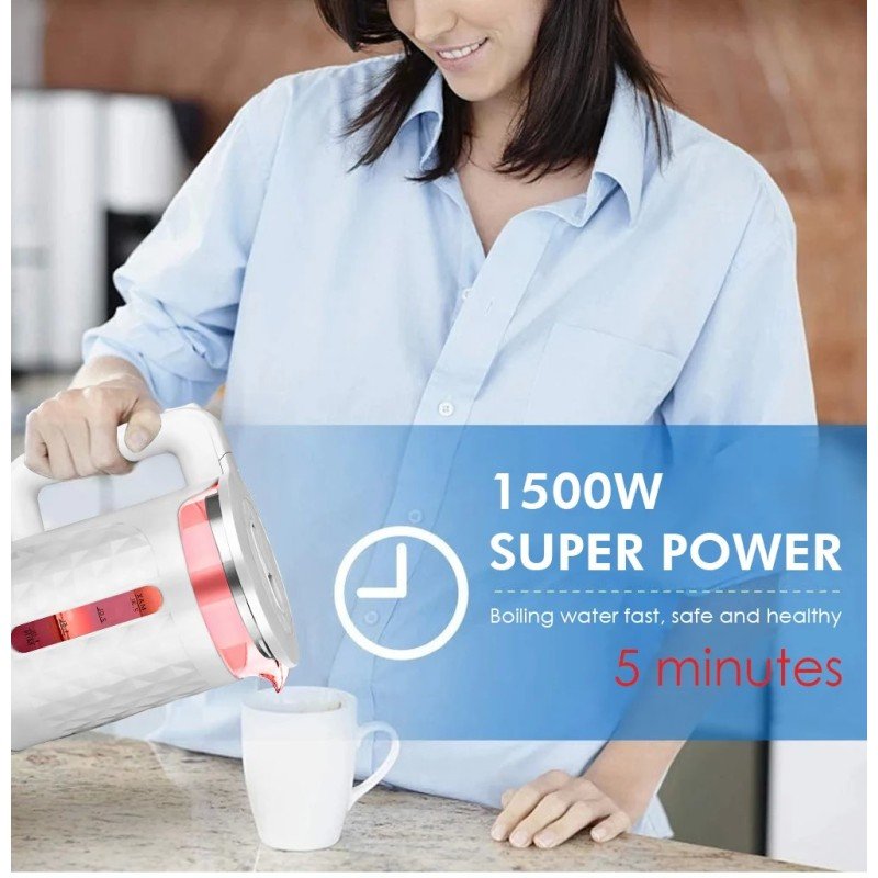 Nuestro hervidor de agua eléctrico de vidrio con vidrio de borosilicato de la mejor calidad, que dura toda la vida, acero inoxidable 201 y calor , copoliéster resistente para el agua más segura y fresca. Controlador de termostato de alta calidad, apagado automático dentro de los 30 segundos después del agua está completamente hirviendo.