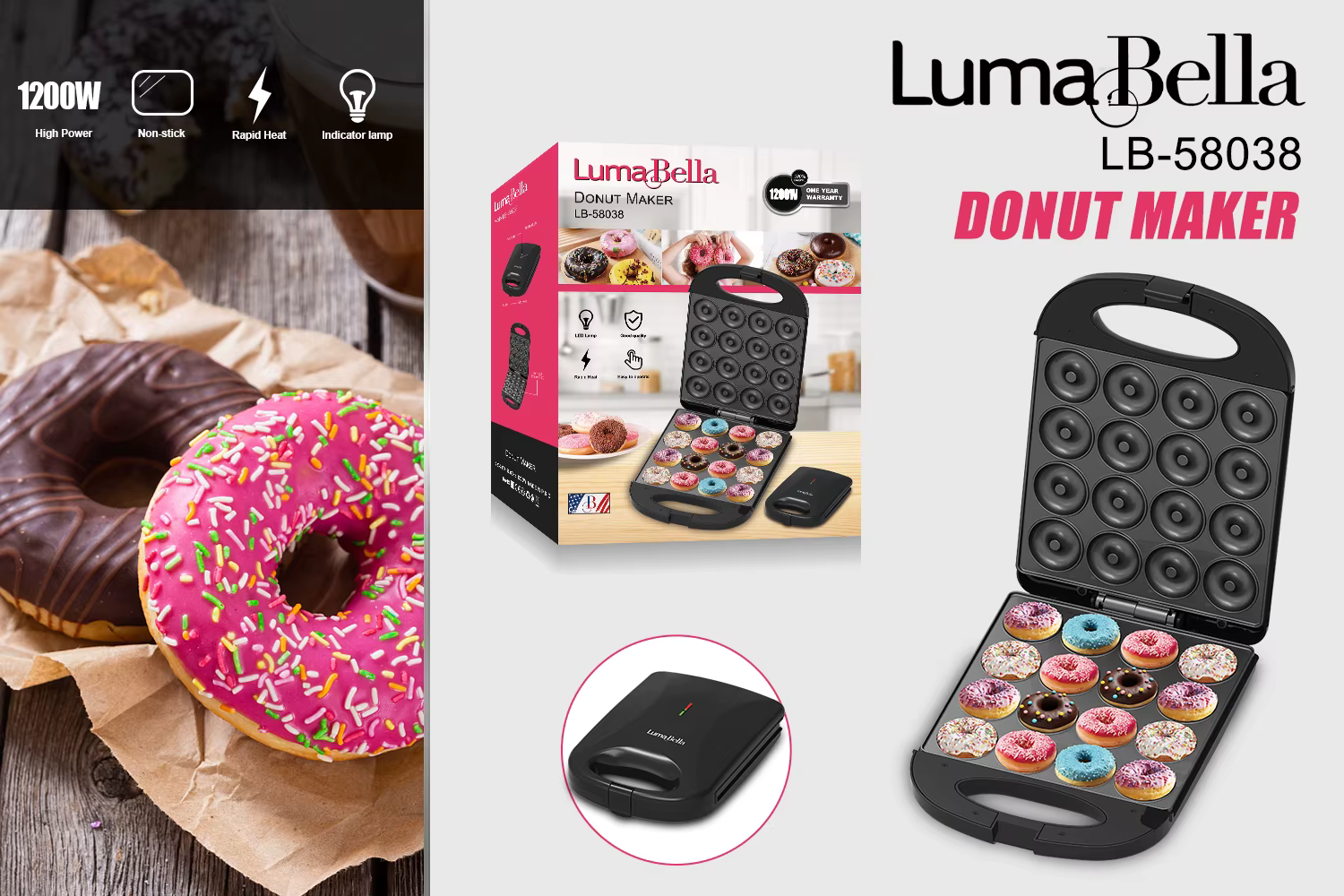 La máquina para donas automática antiadherente LumaBella 58038 es un electrodoméstico eficiente y fácil de usar, ideal para preparar hasta 16 donas simultáneamente en entornos domésticos, hoteleros o al aire libre