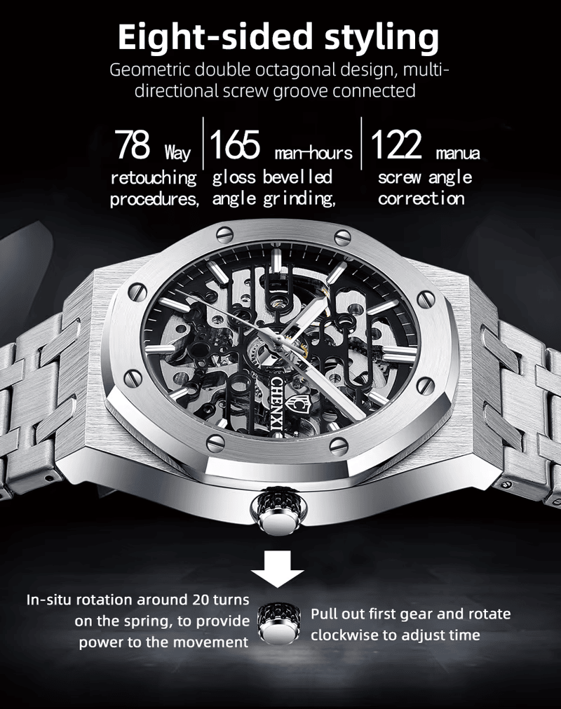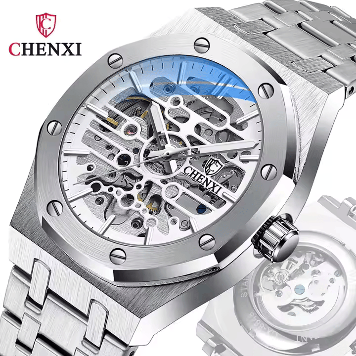 El Reloj Automático CHENXI 8848 es una pieza de alta relojería que destaca por su movimiento automático de precisión, que no requiere baterías y se alimenta del movimiento del usuario. Su esfera esquelética permite apreciar el mecanismo interno, añadiendo un toque de exclusividad y artesanía. Fabricado en acero inoxidable de alta calidad, ofrece durabilidad y resistencia a la corrosión, mientras que el cristal zafiro protege contra arañazos y golpes.