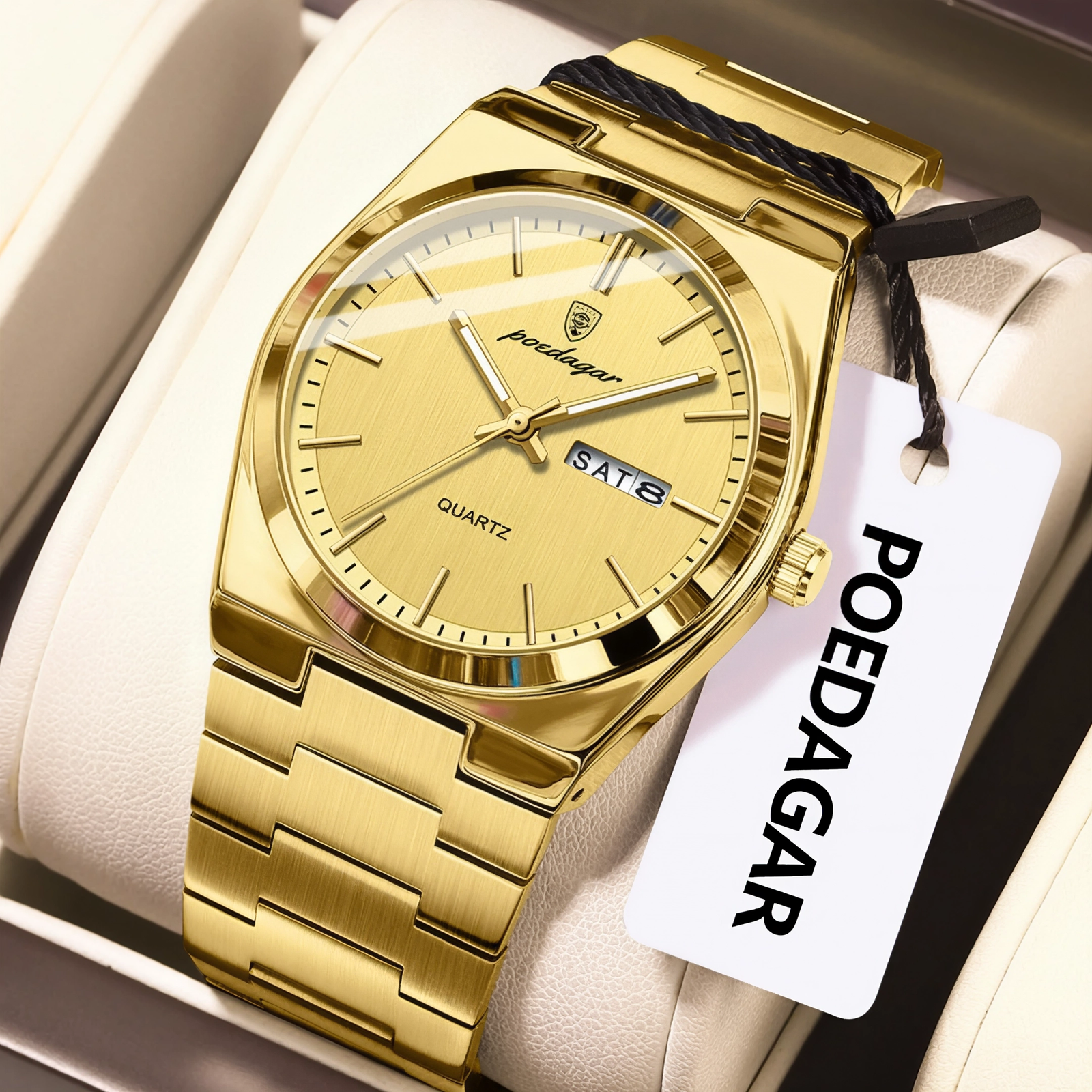 El Reloj Dorado Poedagar 930 es la definición de elegancia masculina. Diseñado para el hombre que valora los detalles, este reloj no solo marca la hora, sino que proyecta una imagen de éxito y sofisticación. Su construcción en acero inoxidable con recubrimiento de alta calidad garantiza un brillo duradero que destaca en cualquier reunión de negocios o evento social.