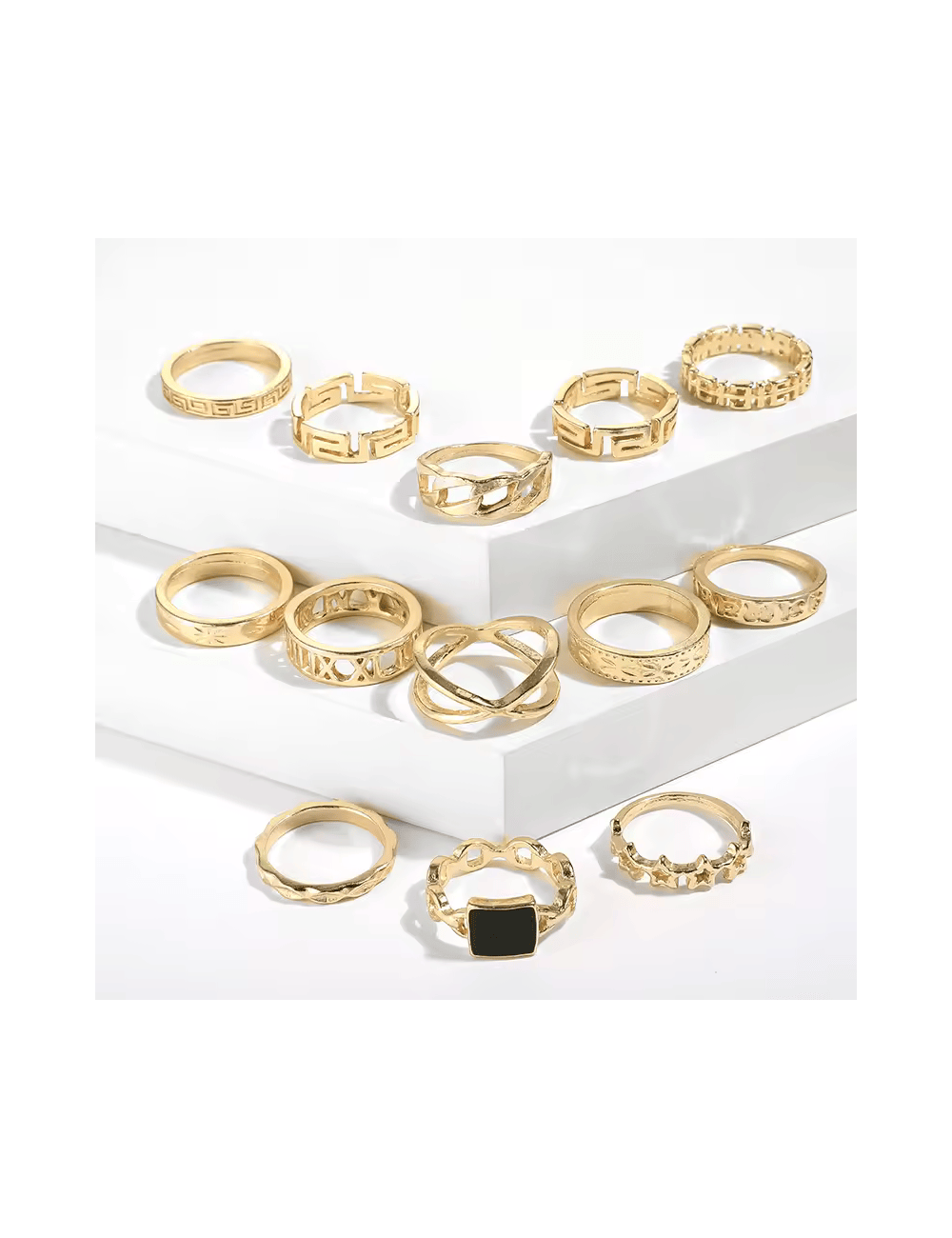 Conjuntos de anillos dorados de lujo para mujer, joyas de boda geométricas con letras de estrella hueca de piedra de cristal negra, accesorios de joyería ,13 unids/set de anillos Punk con personalidad exagerada, anillos Vintage de Color dorado  para mujer