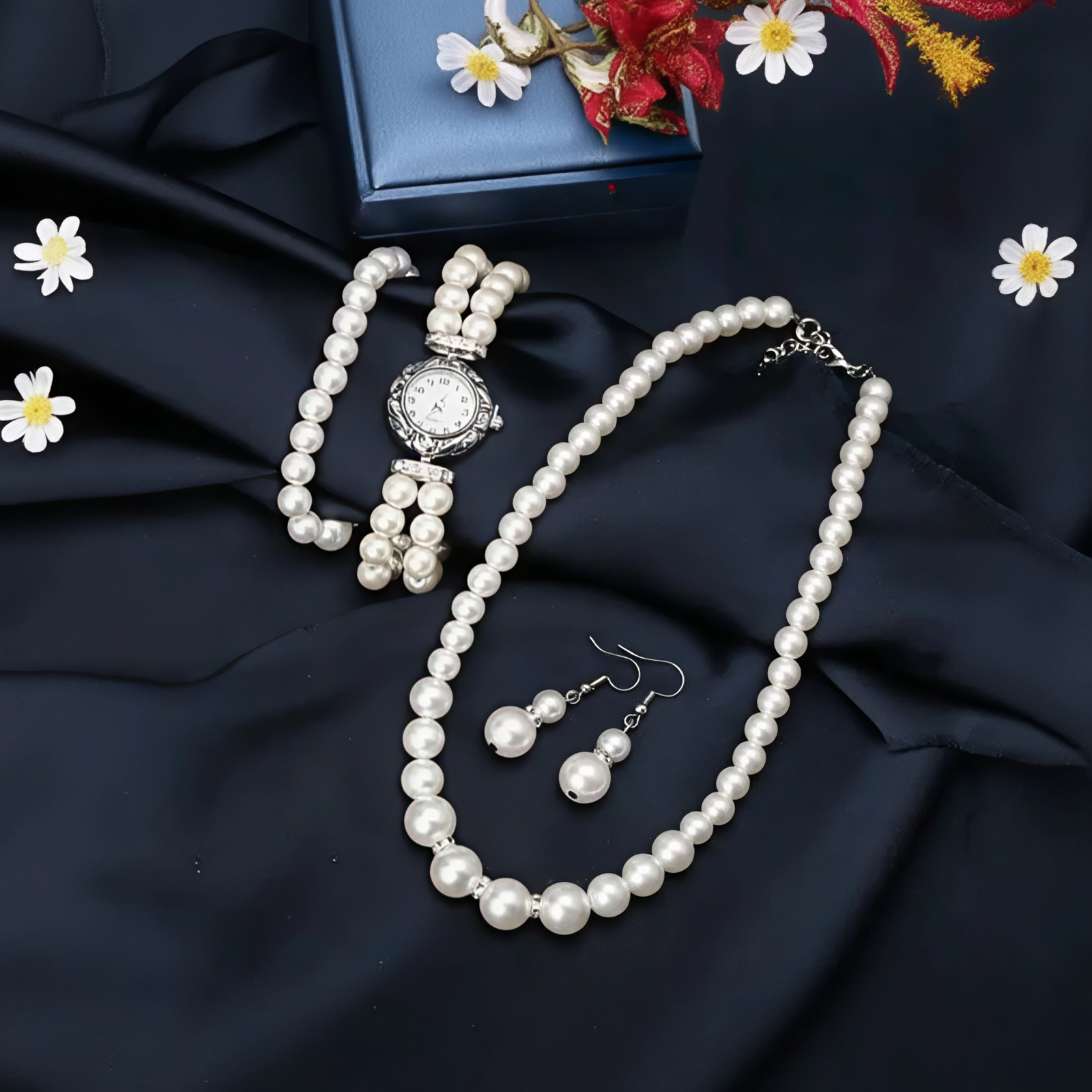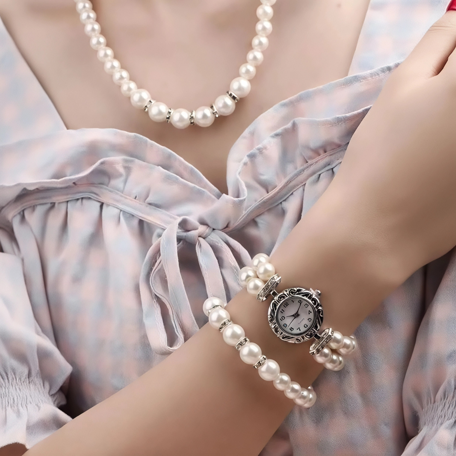 Set Reloj de lujo pulsera,collar, pendientes con perlas para mujeres