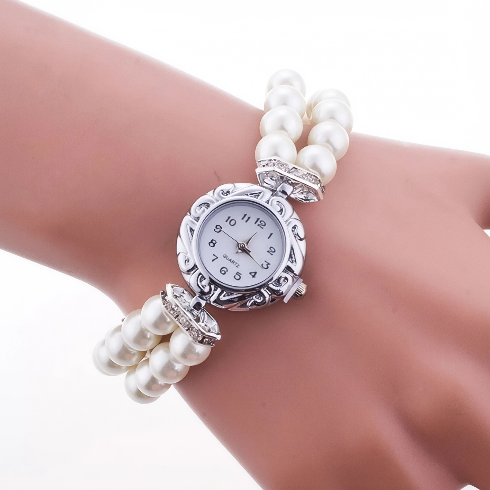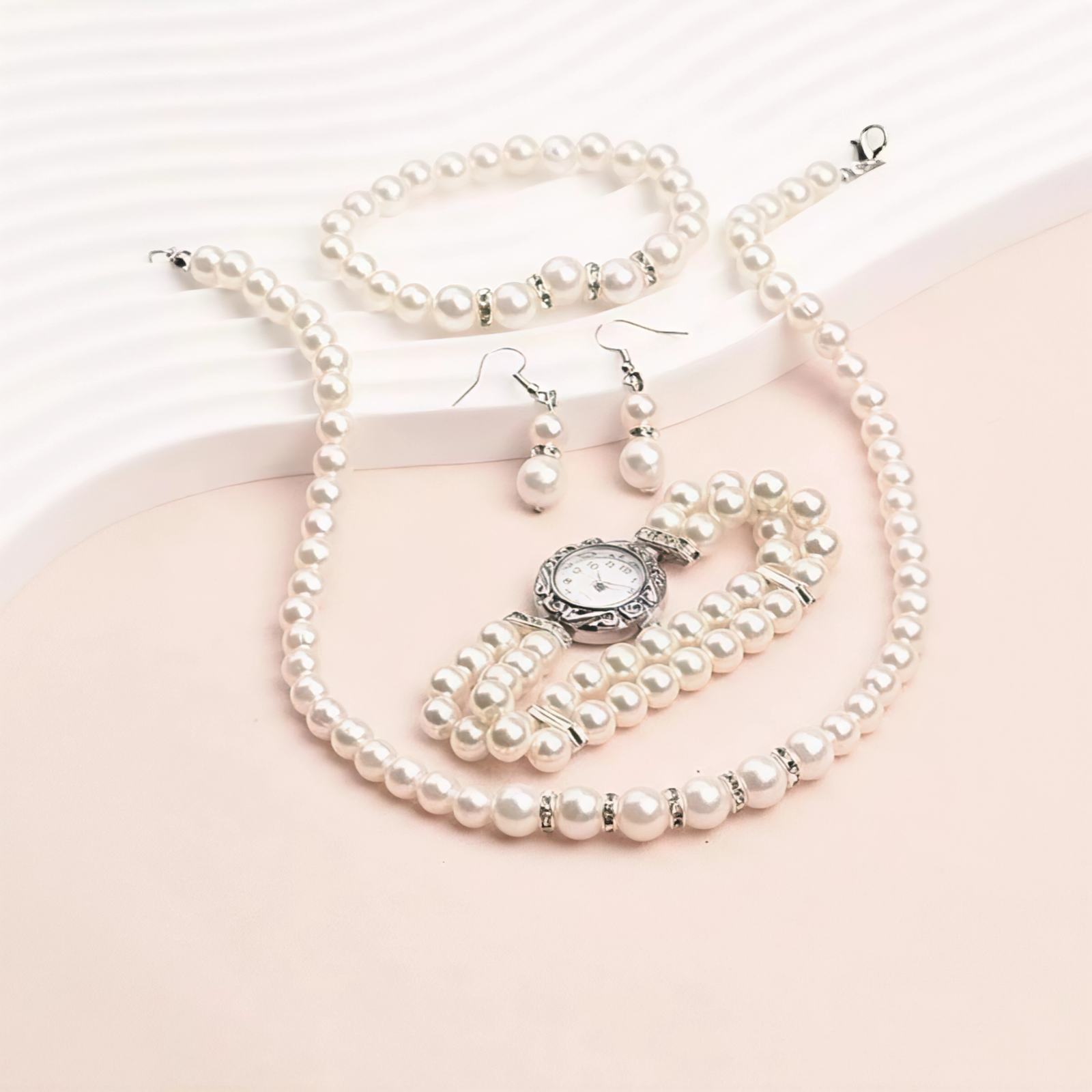 Conjunto de relojes de lujo para mujer, pulsera de perlas, pendientes de tuerca, collar, reloj de pulsera informal de cuarzo