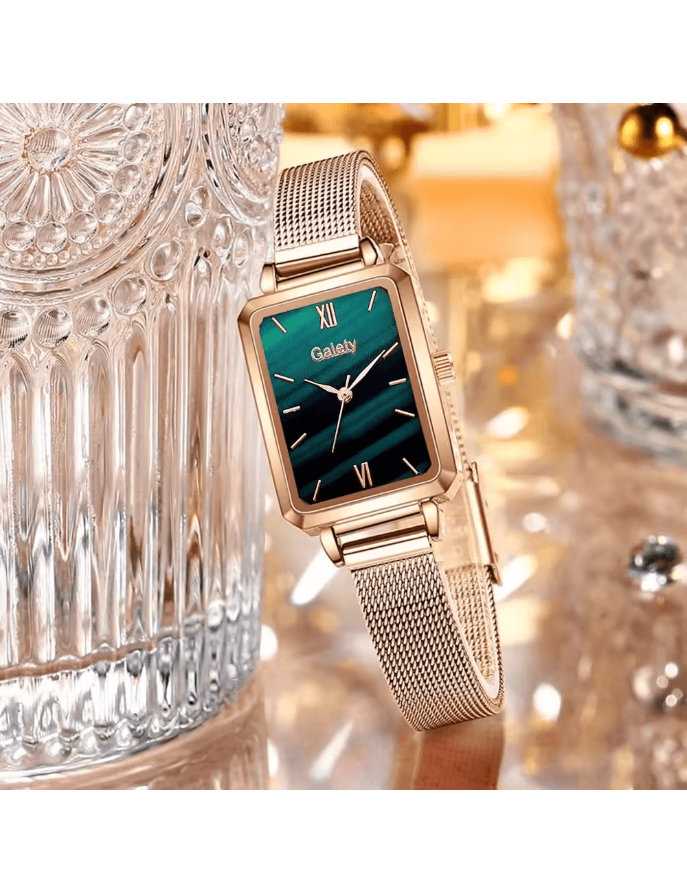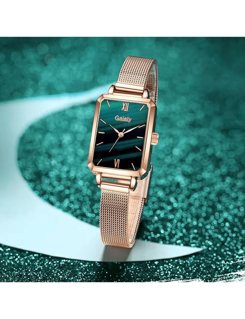 Gaiety-reloj cuadrado de cuarzo para mujer, conjunto de pulsera, esfera verde, malla Simple de oro rosa, relojes de lujo para mujer